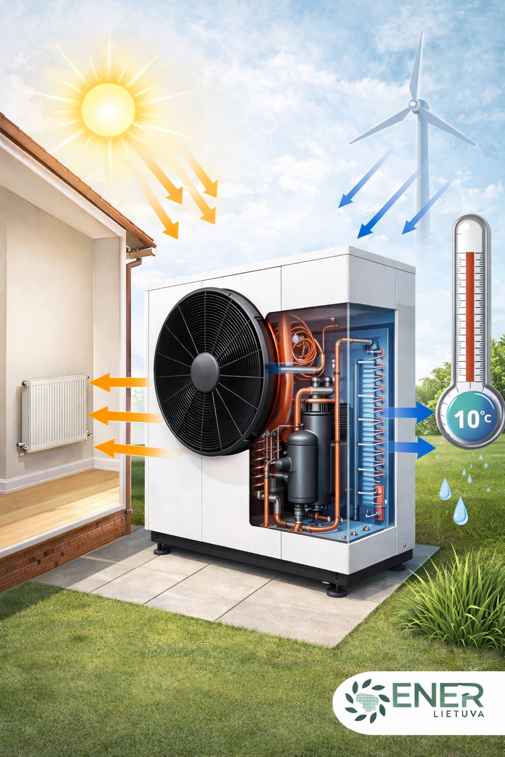 Šilumos siurblys veikia paprastu principu. Jis paima šilumą iš aplinkos (oro, žemės ar vandens) ir perduoda ją į jūsų namų šildymo sistemą. Tai reiškia, kad energija nėra „kuriama“, o tik perkelta, todėl sistema yra ženkliai efektyvesnė nei tradiciniai šildymo būdai.