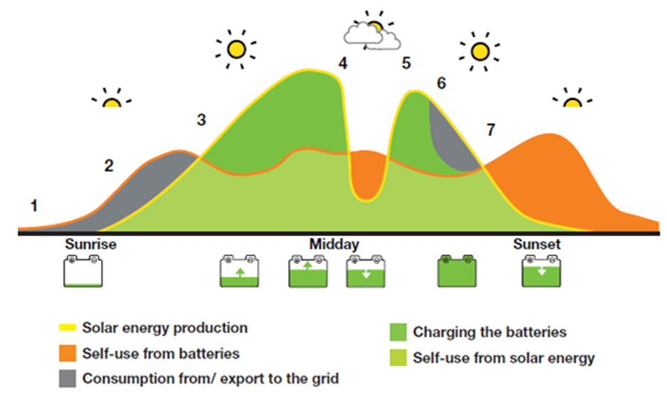 Didelės galios saulės elektrinės dažnai generuoja daugiausia energijos vidurdienį, kai saulės spinduliuotė yra didžiausia. Tuo metu dalis energijos gali likti nepanaudota. 200–400 kWh baterija leidžia sukaupti šį perteklių ir panaudoti jį vėliau – vakare, naktį ar anksti ryte.