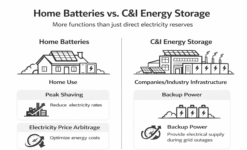 Didžiausias skirtumas tarp namų baterijų ir C&I energijos kaupiklių slypi jų mastelyje, talpoje ir galios parametruose.