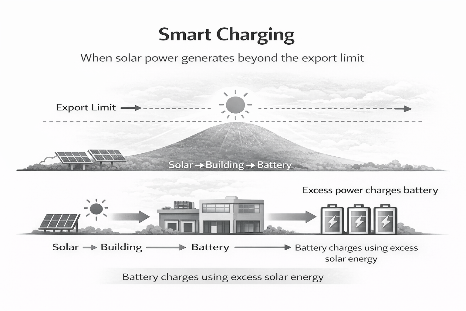 Praktikoje tai reiškia, kad dienos metu saulės elektrinė pagamintą energiją gali nukreipti ne tik į tinklą ar tiesioginį vartojimą, bet ir į bateriją, kuri vėliau energiją atiduoda vakare ar naktį, kai elektros gamyba nevyksta.